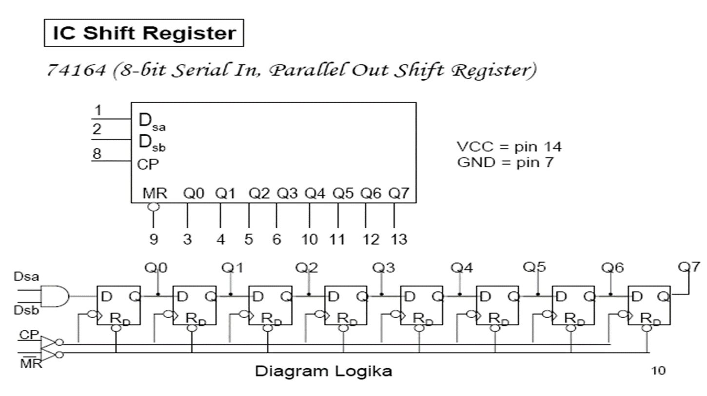 - Bila data digeser dari kanan kekiri disebut “Register geser kiri” (Shift Left Register), sebaliknya bila data digeser dari kiri kekanan disebut “Register geser kanan” (Shift Right Register).